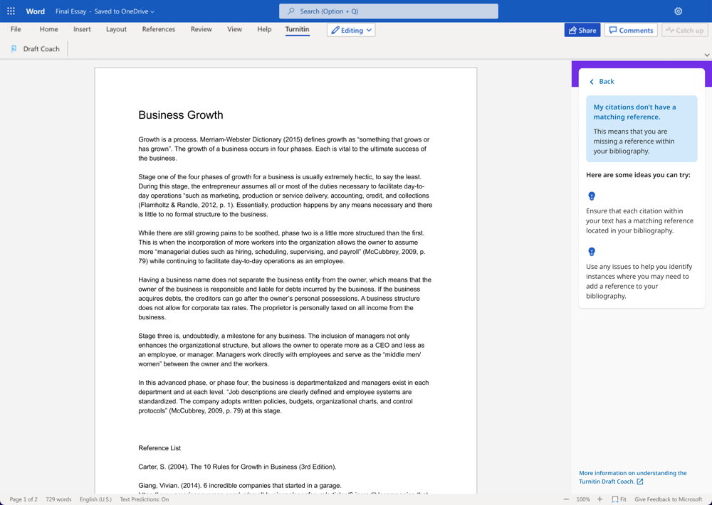 With Turnitin Draft Coach, students access immediate, formative citation and grammar feedback on their essay drafts directly in Microsoft Word online, building students’ writing confidence and skills.